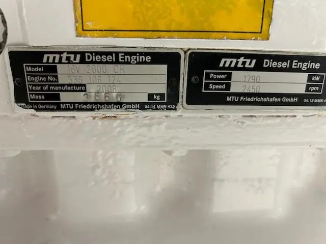 ref#MT0007 Marca: 2x MTU Modelo: 16V2000CR Potencia: 1800 HP RPM: 2450 Numero de horas 542 año: 2006 Condiciones generales: Revisado y funcionando Motores en venta (disponibles dos) Consultar precio